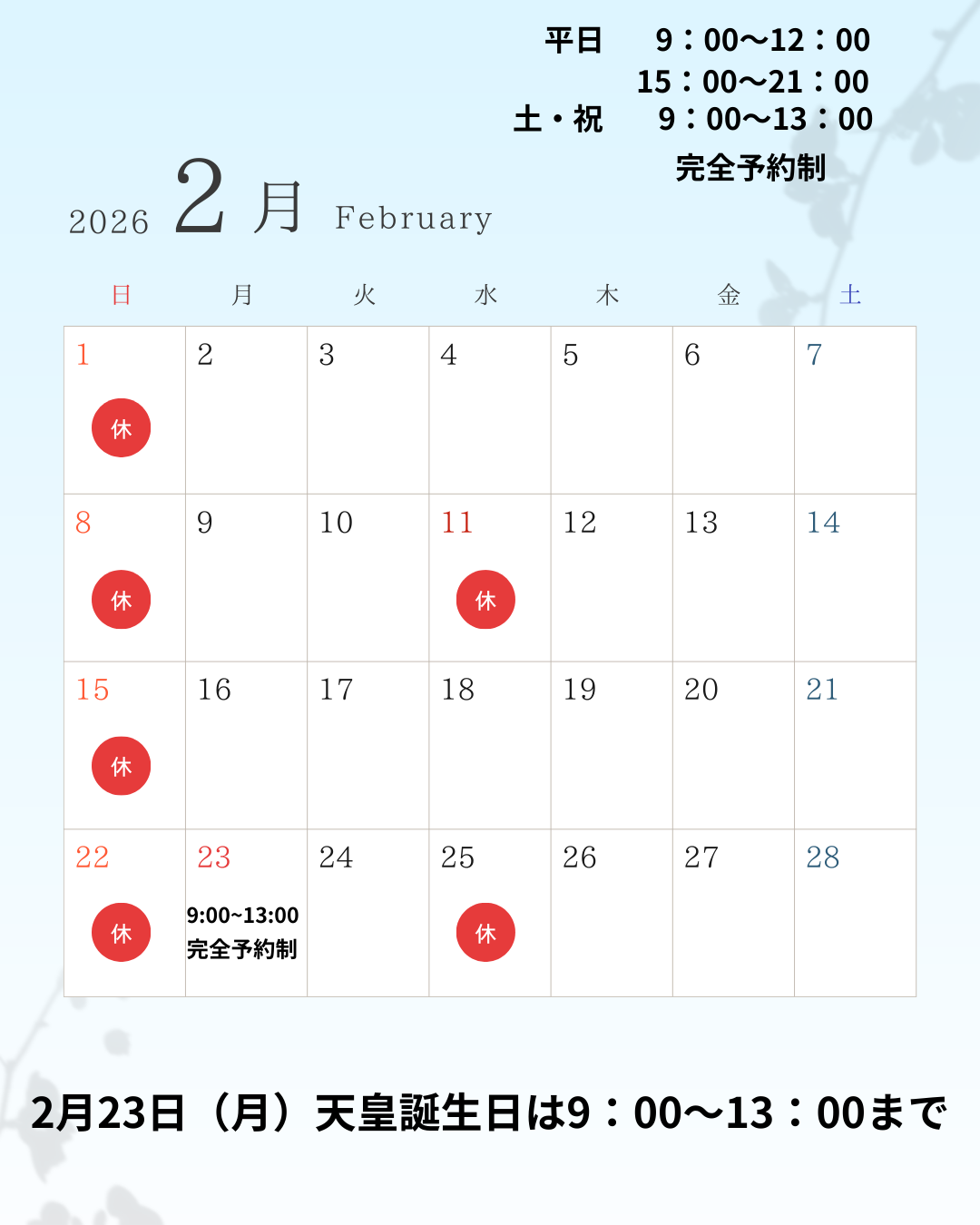 祝日の営業は完全予約制になりますのでご注意ください!!